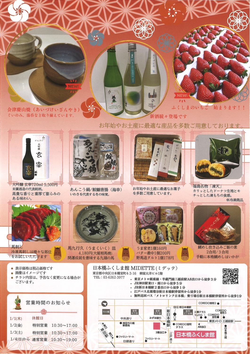いつも日本橋ふくしま館MIDETTEをご利用いただき ありがとうございます。 ■1月2日(金)~5日(月)「新春 ふくの市」を開催いたします。 福袋、新春縁起物商品、特別販売商品などをご用意しております。 2026年も「福がいっぱい」の福島県産品を取り揃え、 みなさまのご来館をお待ちしております。 ※福袋、特別販売商品は商品がなくなり次第終了となります。 ■1月2日(金)、1月3日(土)の営業時間は、 午前10時30分~午後5時までとなります。 ■1月4日(日)から通常営業となります。 午前10時30分~午後7時