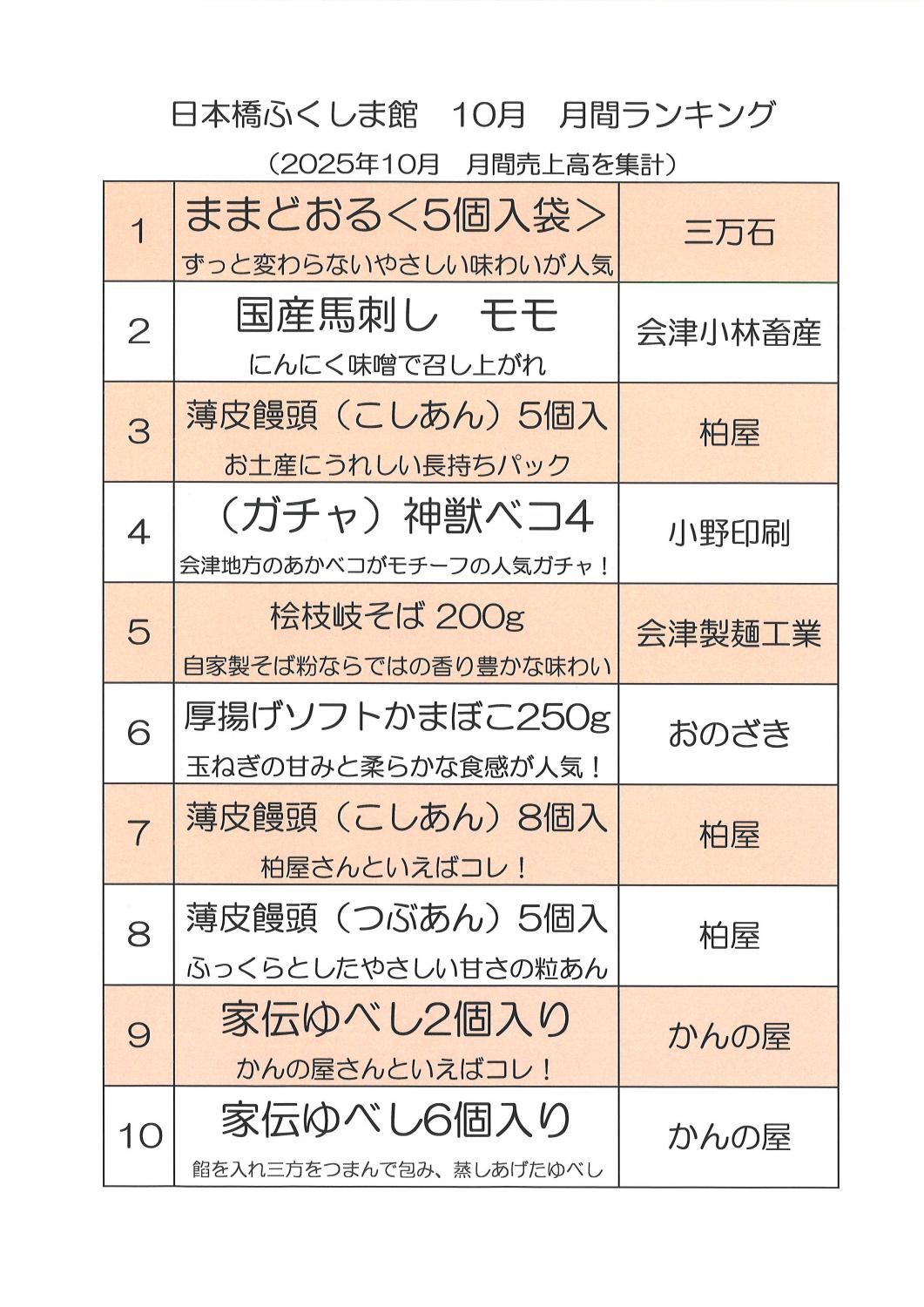 2025年10月 売上ランキング トップ10