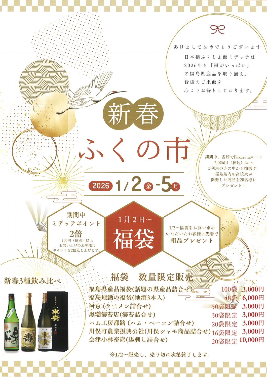 いつも日本橋ふくしま館MIDETTEをご利用いただき ありがとうございます。 ■1月2日(金)~5日(月)「新春 ふくの市」を開催いたします。 福袋、新春縁起物商品、特別販売商品などをご用意しております。 2026年も「福がいっぱい」の福島県産品を取り揃え、 みなさまのご来館をお待ちしております。 ※福袋、特別販売商品は商品がなくなり次第終了となります。 ■1月2日(金)、1月3日(土)の営業時間は、 午前10時30分~午後5時までとなります。 ■1月4日(日)から通常営業となります。 午前10時30分~午後7時